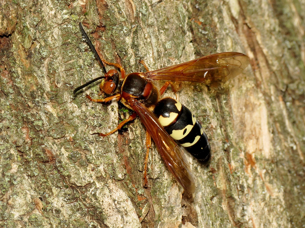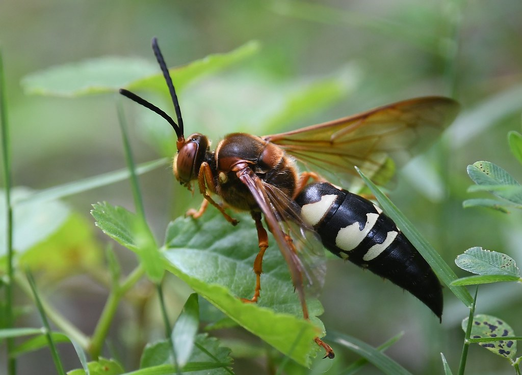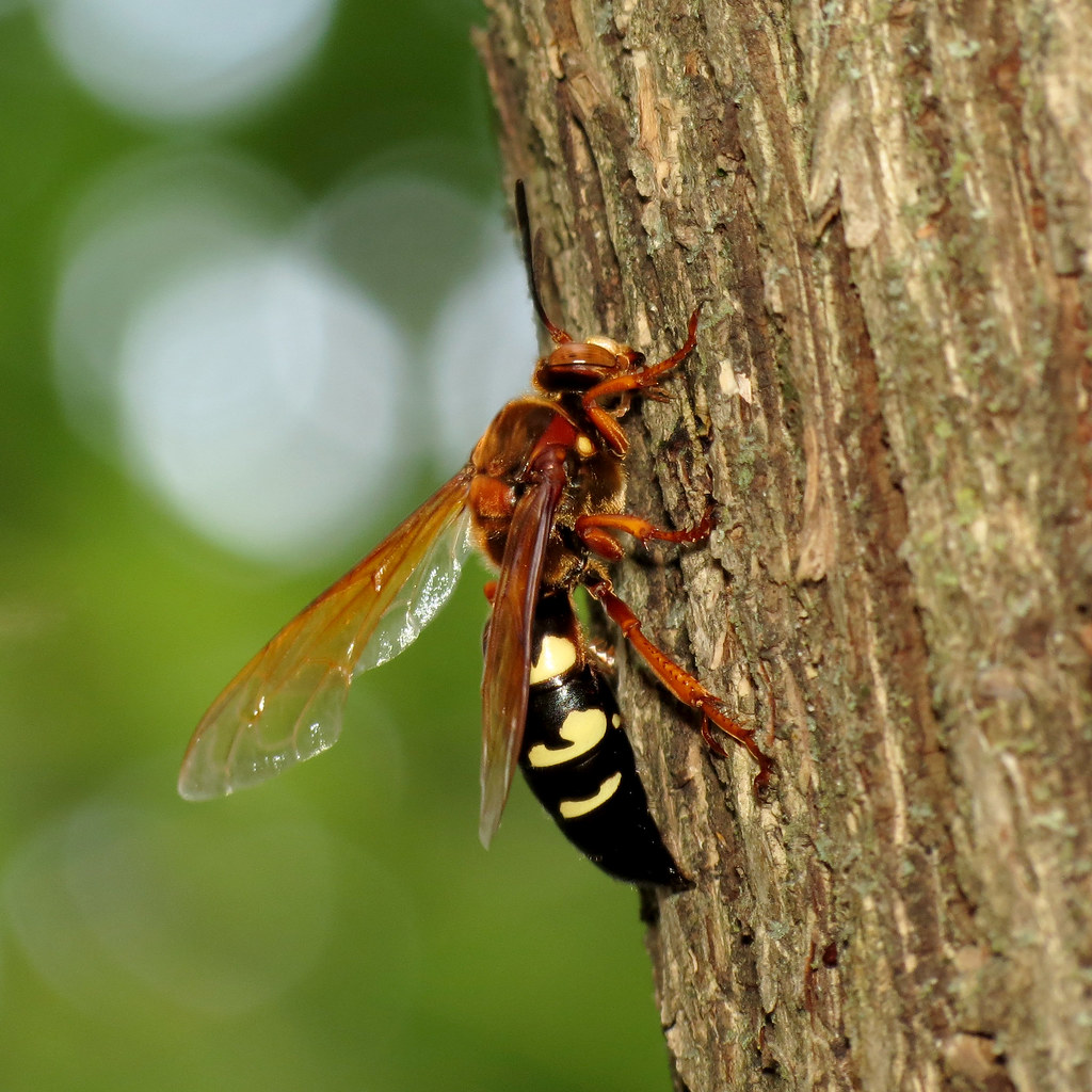 The female cicada killers are the ones to watch out for if you’re a cicada, as they hunt and paralyze them to use as food for their larvae.